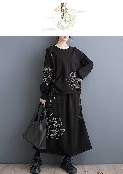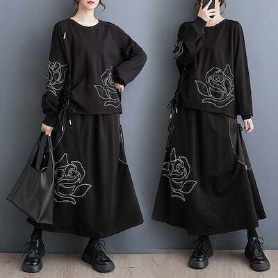 「ファットガール」 2023秋冬 花柄 刺繍 ゆったり 上下セット おしゃれ レディース セットアップ 巾着 スウェット+スカート メガ割