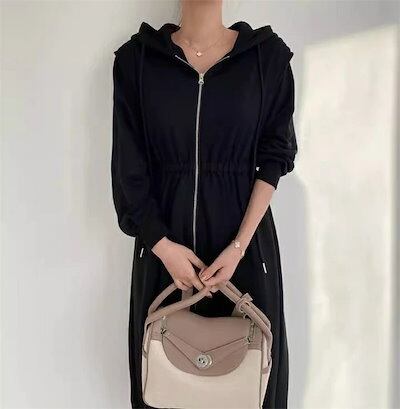 パーカーワンピース レディース 長袖 ジップアップ フード付き パーカー ワンピース フレア ロング ミモレ ファスナー ウエストゴム ガーリー フェミニン 可愛い 春 秋 冬 ブラック グレー ホワ | KAGEYAMA-SECOND