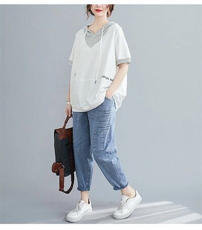 パーカー 半袖 スウェット レディース 夏 秋 春 トレーナー フード付き 半袖パーカー トップス 重ね着 レイヤード風 無地 シンプル ゆったり カジュアル 大きいサイズ ゆるっと 着?せ お洒落 | KAGEYAMA-SECOND
