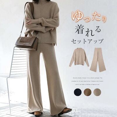 セットアップ ニット パンツ レディース 秋冬 春 長袖 ニットセーター プルオーバー ワイドパンツ ワイド ハイウェスト ウェストゴム トップス ボトムス リブニット 上下セット サイドスリット ゆ | KAGEYAMA-SECOND