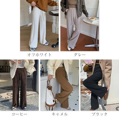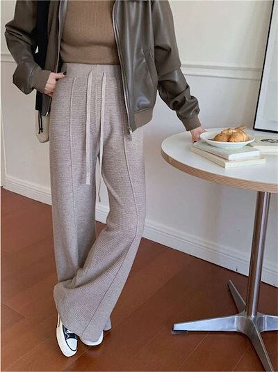 ニットパンツ ロング丈 レディース ボトムス ゆる リブ ワッフル 防寒 保温 ズボン イージーパンツ ロングパンツ 春 秋 冬 ワイド ハイウェスト 体型カバー カジュアル リラックス ウエストゴム | KAGEYAMA-SECOND