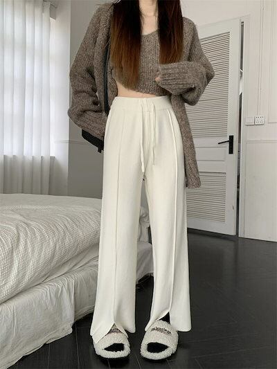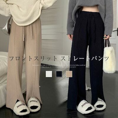 ニットパンツ ワイドパンツ レディース 春 秋 冬 フロントスリット ガウチョパンツ ウエストゴム ニット ゆるパンツ ストレートパンツ リラックス ゆったり 楽ちん ロングパンツ フレアパンツ 美脚 | KAGEYAMA-SECOND