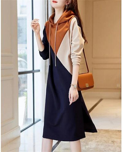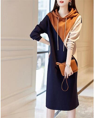 パーカーワンピース レディース 春 秋 長袖 きれいめ フード付き ワンピース バイカラー スウェット 膝丈 切り替え マルチカラー カジュアル ゆったり ロング丈 切り替えワンピース 体型カバー 春 | KAGEYAMA-SECOND