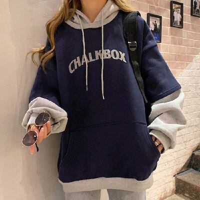 パーカー レディース 長袖 裏起毛 重ね着 レイヤード風 春 秋 トレーナー フード付き パーカー 切り替えトップス 無地 シンプル ゆったり カジュアル 大きいサイズ ゆるっと ビッグシルエット