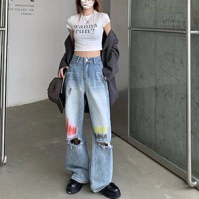 新入荷ダメージジーンズ ワイドパンツ gパン ストレート ハイウエスト ゆったり ロングパンツ ボトムス カジュアル ヒップホップ ダンス ギャル 長ズボン レディース 春夏秋 ファッション 10-3 | KAGEYAMA-SECOND