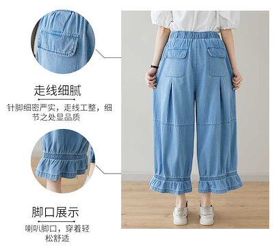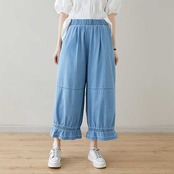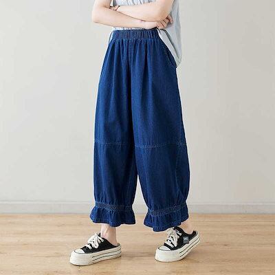 「ファットガール」 九分丈 デニムパンツ ワイドパンツ ジーンズ フリル フレア 夏 ゴム 体型カバー 大きいサイズ ゆったり レディース