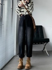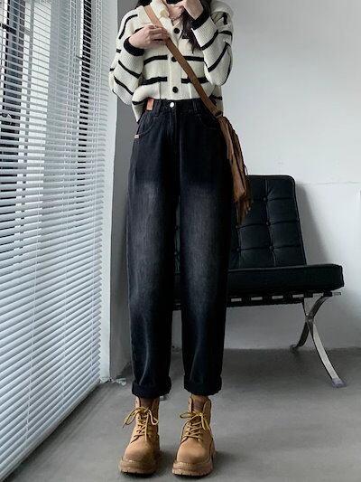 韓国ファッション デニムパンツ ギャザージーンズレディース秋冬新作ハイウエストビッグサイズで痩せ見えワイドパンツ