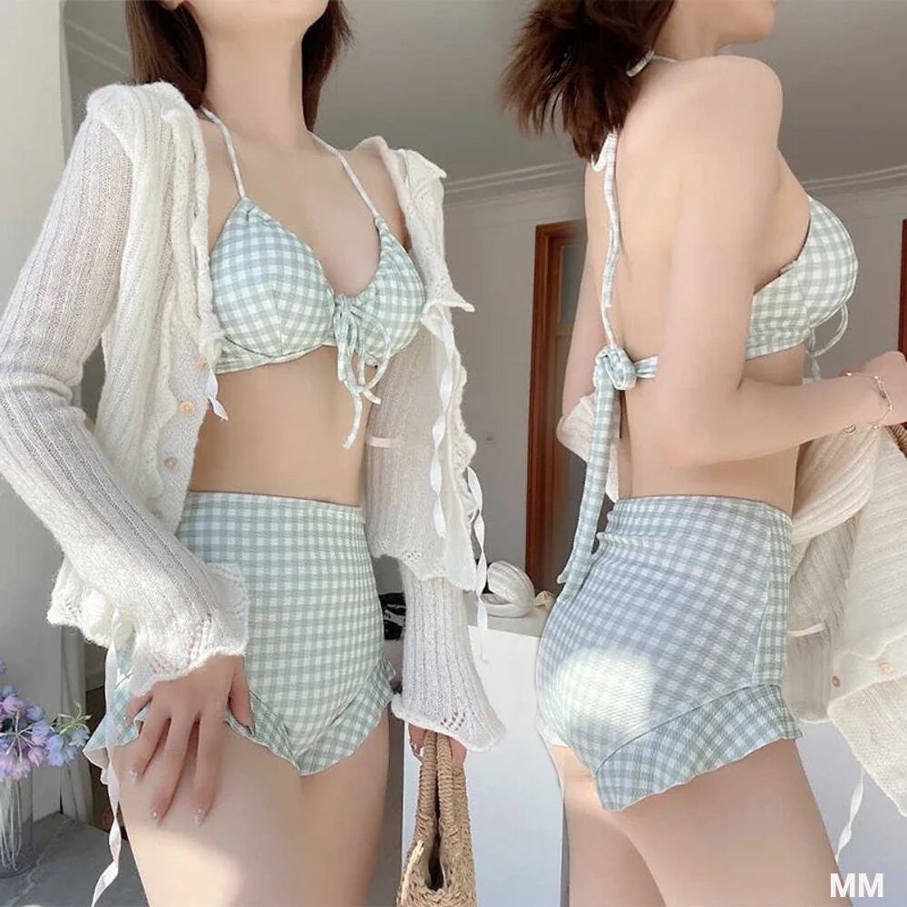 女性用チェッカー水着,和風フリル冷蔵庫,モノキニ,韓国風,2枚 韓国系水着 セパレート水着 ワンピース水着 T240626152825_04