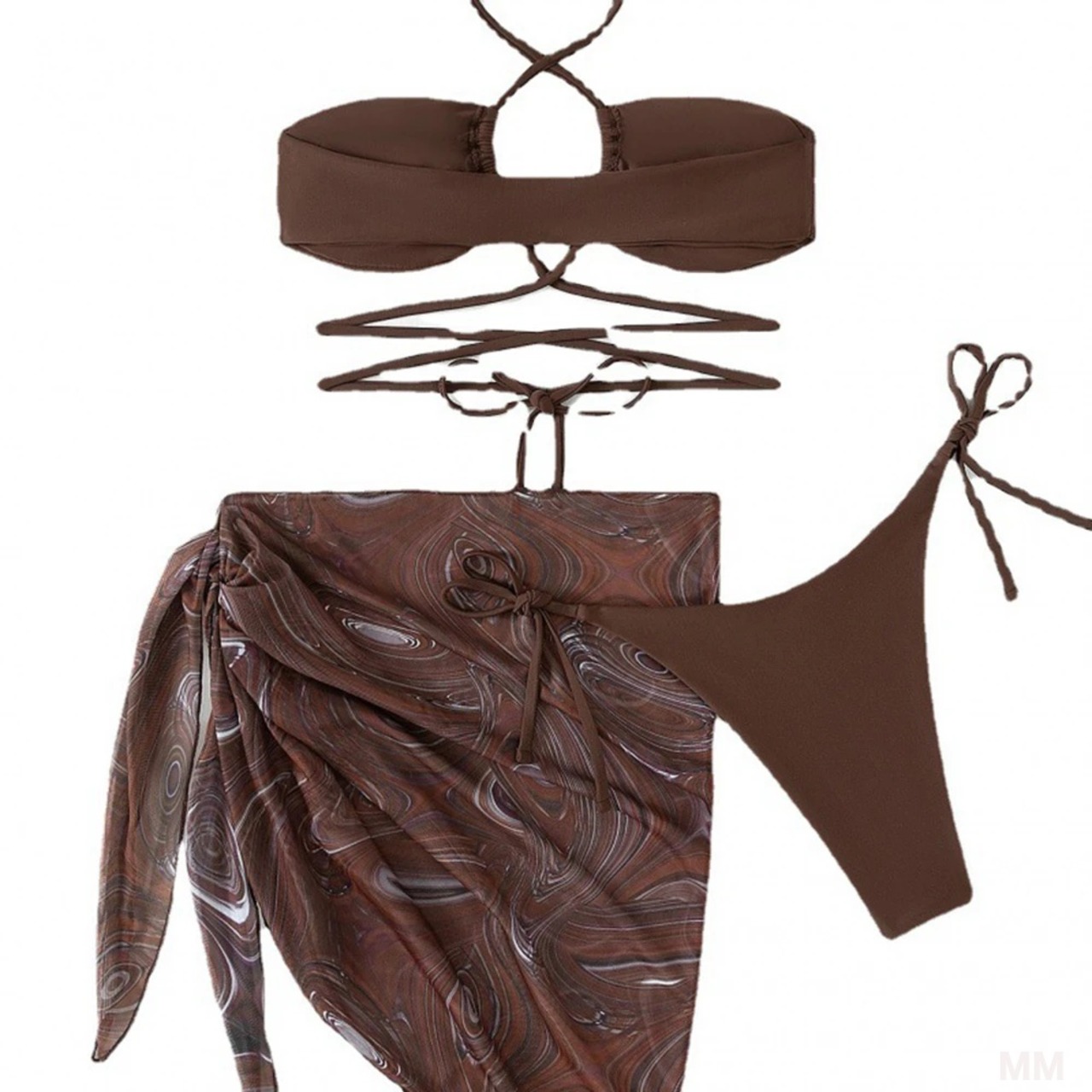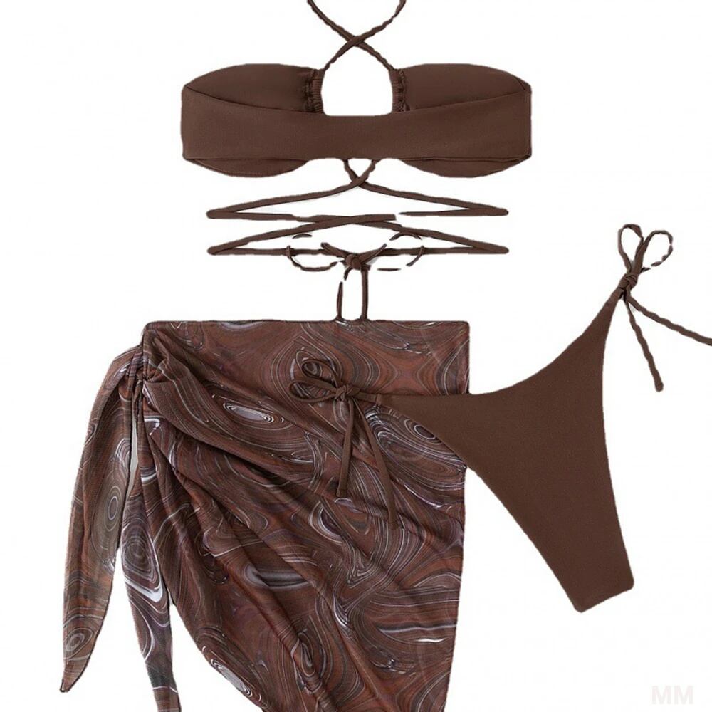 モデル番号:Halter Thong Bikini 3 Pieces Solid Bikini Set With Printed Skirt