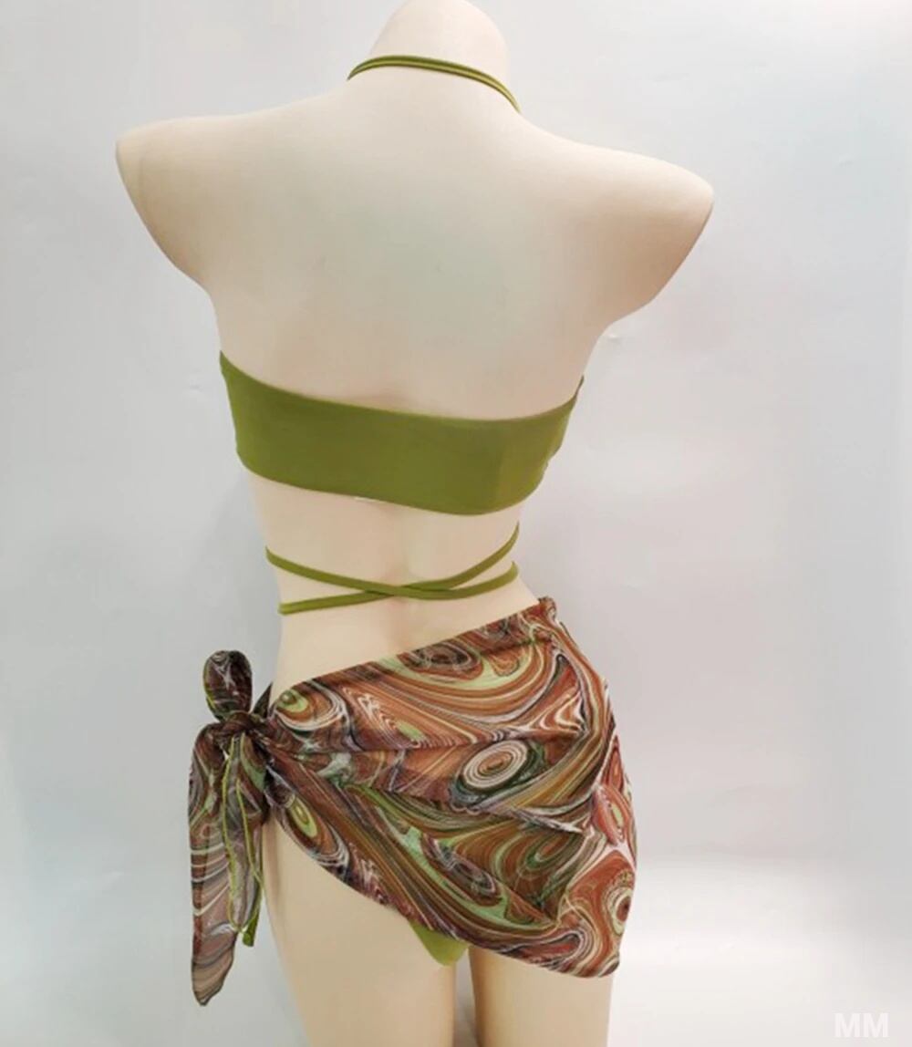 モデル番号:Halter Thong Bikini 3 Pieces Solid Bikini Set With Printed Skirt