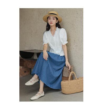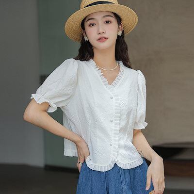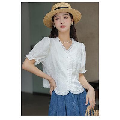 半袖ブラウス レースブラウス レディース 20代30代 vネック 白tシャツ 上品 気質 春夏トップス ゆったり 韓国風 透かし彫り スカラップ きれいめ 大きい★7 | KAGEYAMA-SECOND