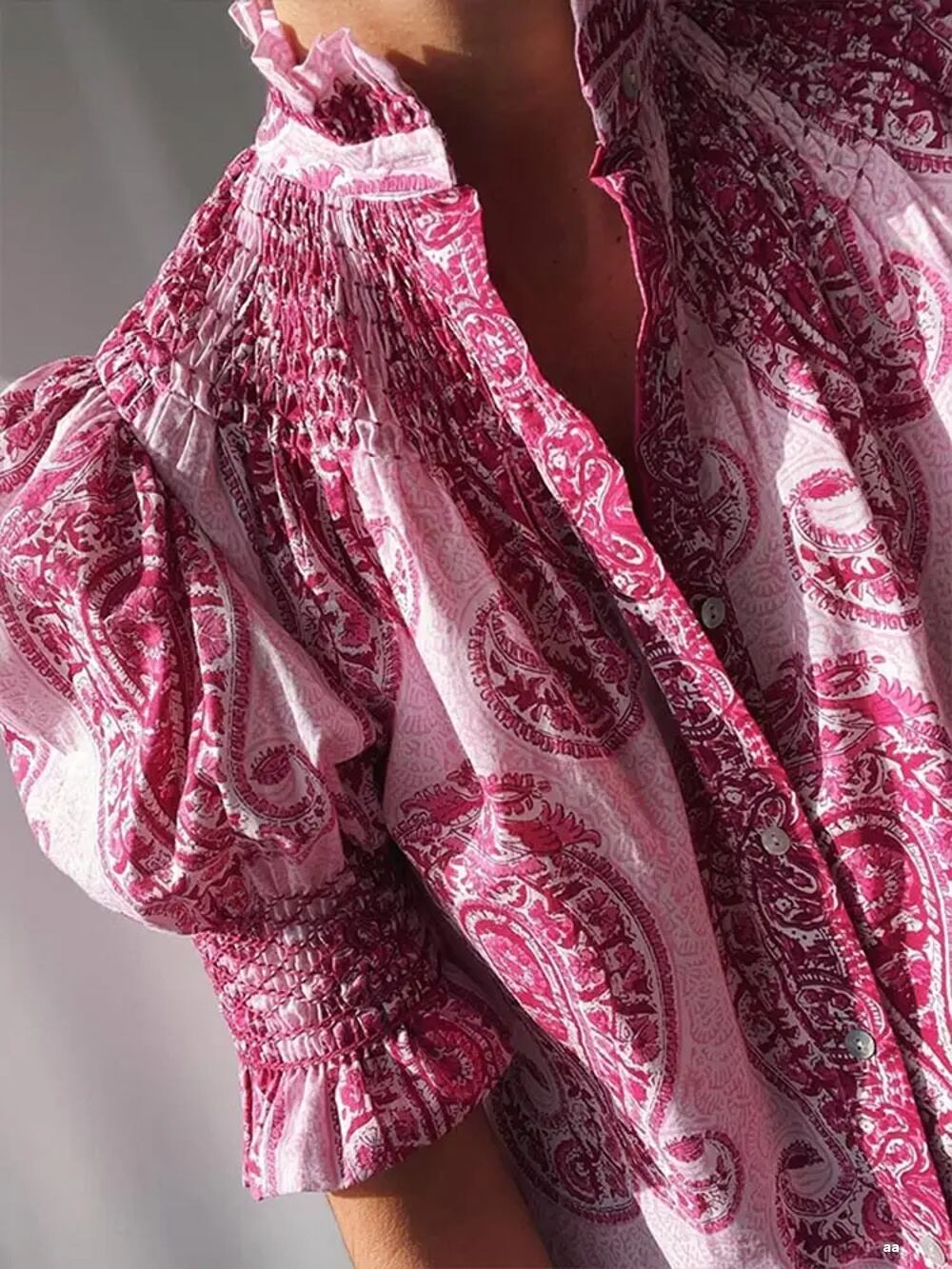 女性のヴィンテージエスニックプリントのプリーツブラウス、シックなスタンドネック、半袖パフスリーブ、ボタンシャツ、エレガントなストリートウェア、春の女性、2022 ボトム ボトムス ズボン T240619142130_01 | KAGEYAMA-SECOND