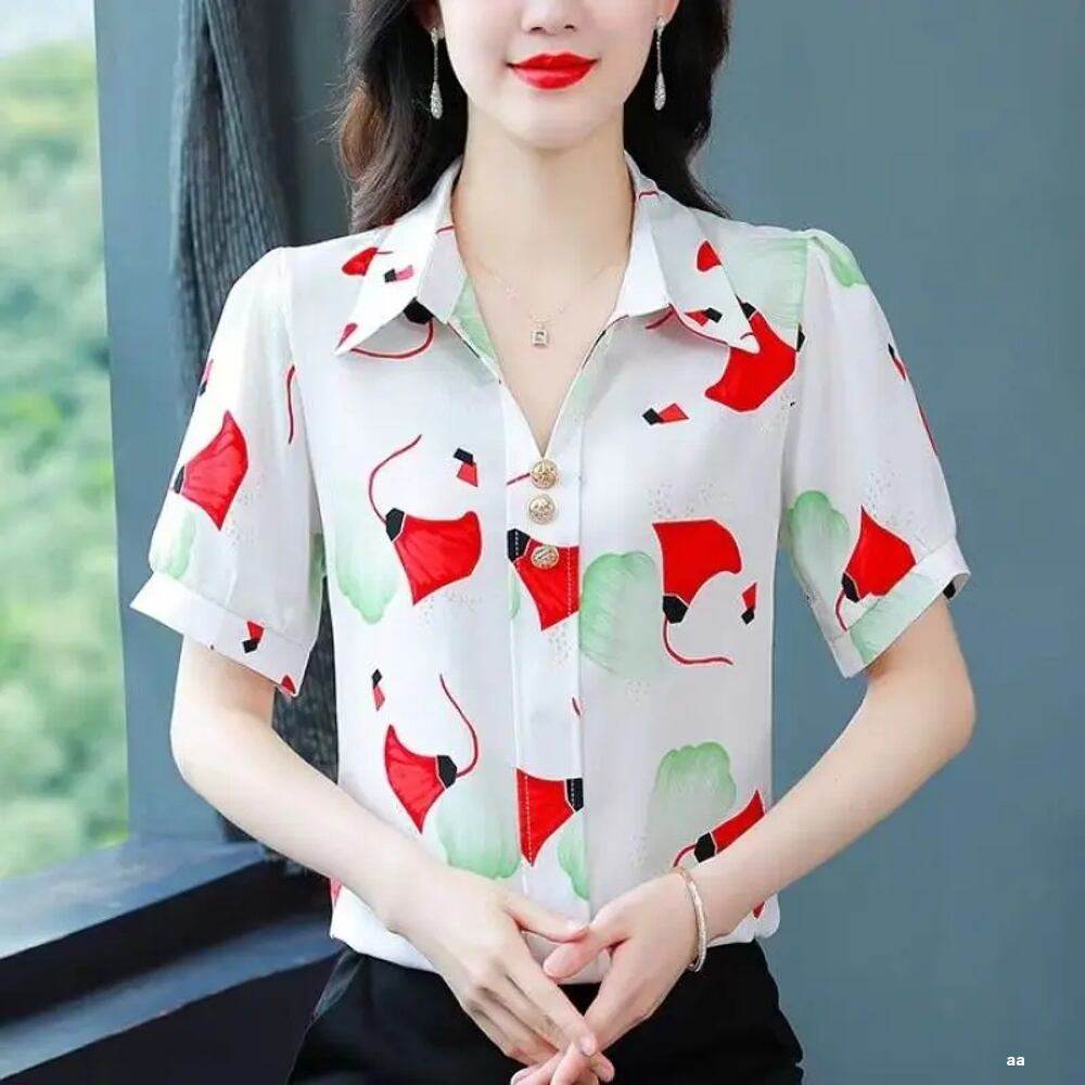 女性用Vネック半袖シフォンシャツ,ルーズフィット,カジュアル,ボタン付き,エレガントなファッション,夏 ボトム ボトムス ズボン T240619142307_02