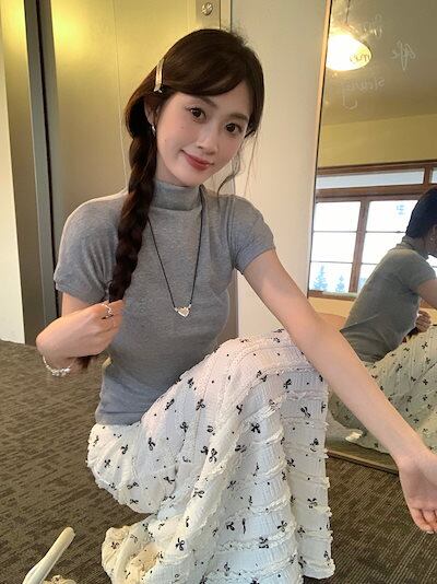 2024 春夏 甘い トップス Tシャツ ラウンドネック 2色展開丈 休日 ファッション スリムフィット丈短め ショート へそ出し 休日 おしゃれ T