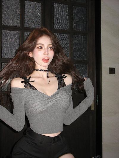 2024春夏 フェイクツーピース トップス レイヤード風 tシャツ 重ね着風 カットソー 長袖 インナー ショート タイト フィット T カジュアル きれいめ フェミニンフレンチモックネック | KAGEYAMA-SECOND