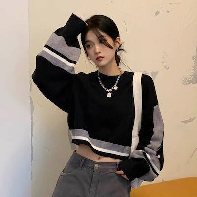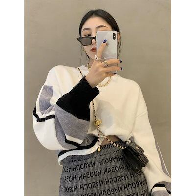 韓国ファッション パッチワーク コントラストカラー 精緻 セーター プルオーバーデザイン ゆったり アンダーウェア ゆったり ニットカーディガン ショート 長袖 トップス | KAGEYAMA-SECOND