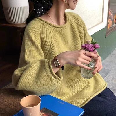 ベーシックニット フレンチシックイエローニットセーターヘッダー新作女性太い棒針ゆったりけだるい風トップス