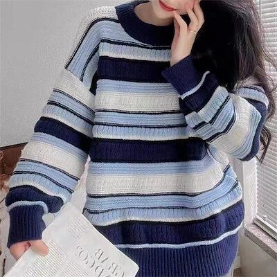 ジェントルスタイル 柔らかい プルオーバーデザイン しま模様 レトロ ゆったり セーター 秋冬 ウォーム ベ一シックニット レディース トップス