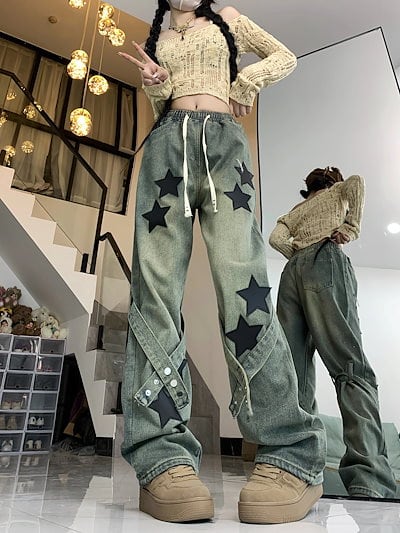ジーンズ デニムパンツ gパン カーゴパンツ ワイドパンツ ハイウエスト 星 ロングパンツ ストレート ボトムス レディース 春 秋 冬 ヒップホップ カジュアル ダンス 長ズボン ファッション | KAGEYAMA-SECOND