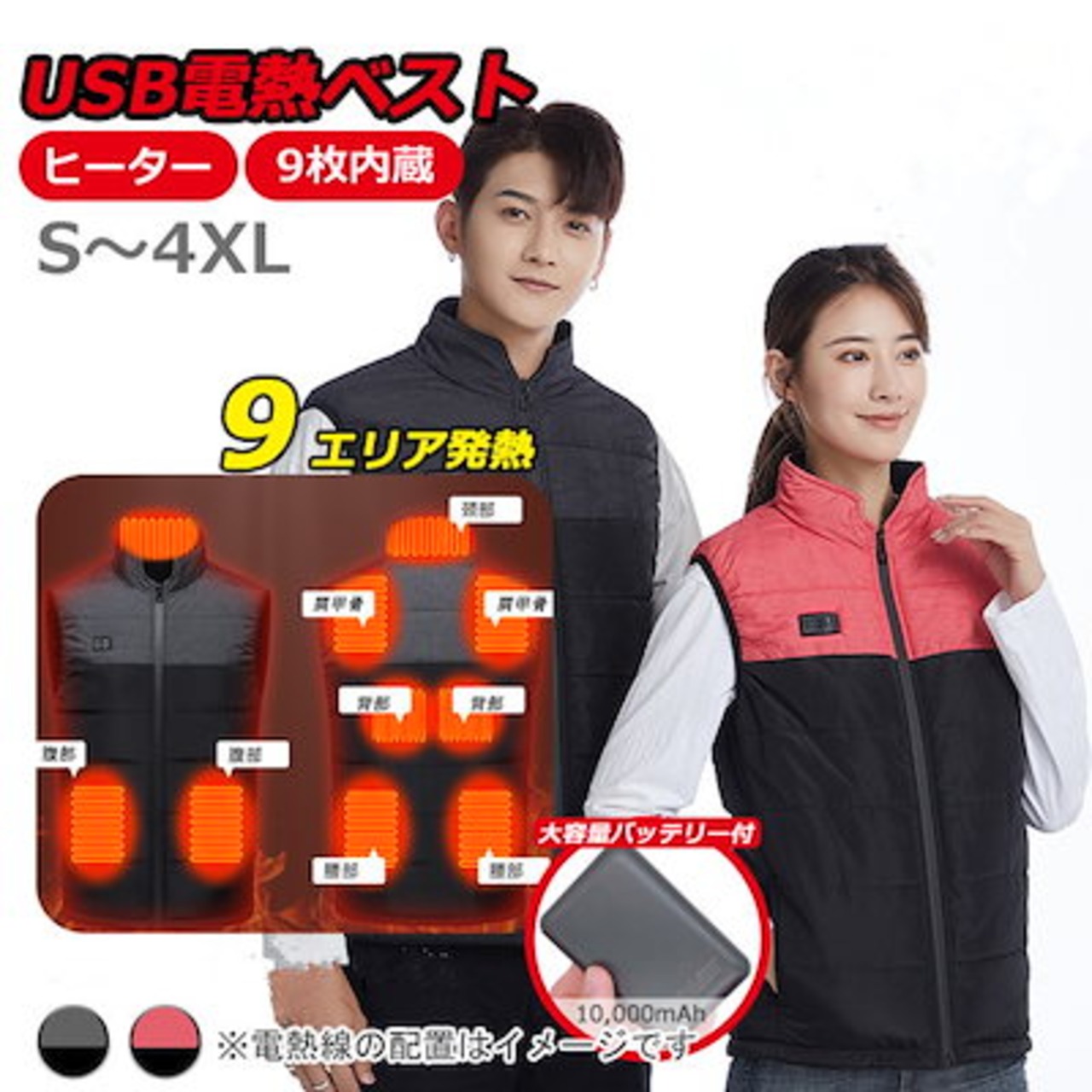 ヒーター9枚内蔵 モバイルバッテリー付き 電熱ベスト 防寒ベスト ヒートベスト ホットベスト USB加熱ウェア 3段温度調整 バイク 釣り キャンプ ゴルフ スキー 水洗い可 大きいサイズ | KAGEYAMA-SECOND