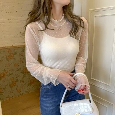 ボトムシャツ ハーフハイネックレースボトムシャツレディース秋新作レディース長袖メッシュトップス