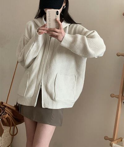 パーカー ニット レディース ジャケット フード付き コート ショート丈 トップス セーター 無地 体型カバー ポケット付き 大人 暖かい 柔らかい 軽量 防寒 シンプル ダブルジップ 通勤 普段着 | KAGEYAMA-SECOND