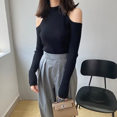 オフショルダー ニット セーター トップス レディース 秋冬 プチハイネック タートルネック リブニット 長袖 袖長め 柔らか ソフト フェミニン 女性らしい 上品 通勤 オフィス オシャレ デザイン | KAGEYAMA-SECOND