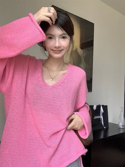 2024秋冬トップス ニット Vネック 薄手 長袖 ゆったり パステルカラー ソフトカラー 秋 おしゃれ かわいい 韓国ファッション レディース お出かけ
