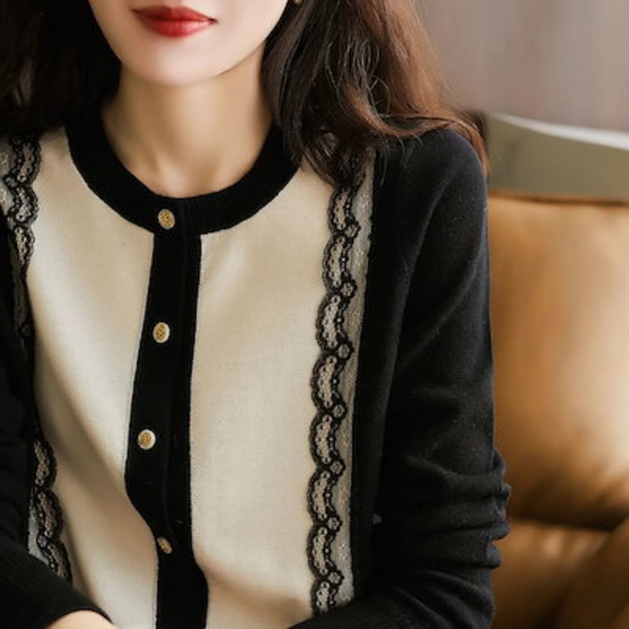 ト エレガント レース切り替え丸ネックニット カーディガンチュニックアウター