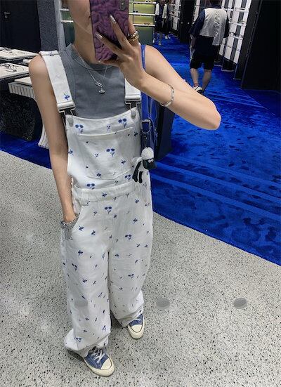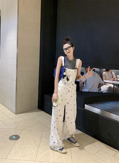 2024春夏オーバオール サロペット つなぎ ノースリーブ ロングパンツ 白 ホワイト さくらんぼ チェリー かわいい おしゃれ カジュアル 夏 韓国ファッション レディース お出かけ | KAGEYAMA-SECOND