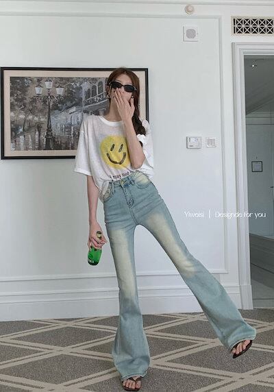 2024春夏パンツ デニム ジーンズ スキニー ワイドレッグ ハイウエスト 脚長効果 美脚効果 細見え ダメージ加工 春 白 水色 カジュアル おしゃれ かわいい 韓国ファッション レディース お出か | KAGEYAMA-SECOND