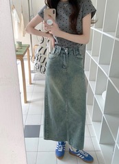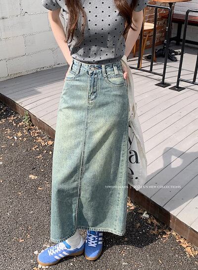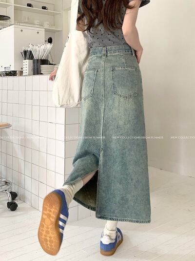 2024 春夏スカート デニム生地 ミモレ丈 スリット バックオープン Aライン ハイウエスト 脚長効果 美脚効果 細見え 夏 水色 ライトブルー かわいい カジュアル 韓国ファッション レディース | KAGEYAMA-SECOND