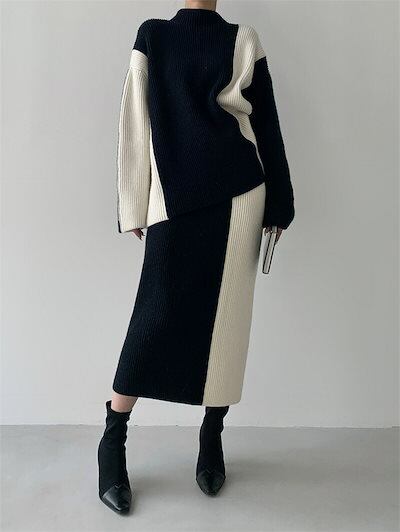 ニットセットアップ レディース ニットセーター スカート セットアップ 秋冬 長袖 ロング丈 ハイネック セーター タイトスカート プルオーバーセーター カジュアル 配色 黒 白 ゆったり 2点セット | KAGEYAMA-SECOND