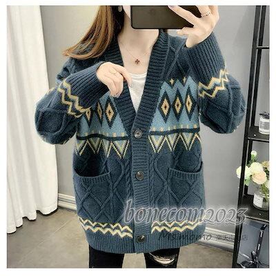 ネックカーディガン ニットカーディガン ショット丈セーターアウター ニットコーディガン 民族風 秋服 レディース 秋冬代長袖 韓国風 ゆったり オシャレ
