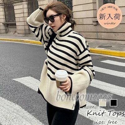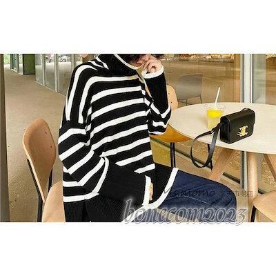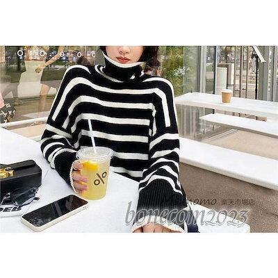 レディース ハイネック ゆったりプルオーバー オシャレ韓国風 秋冬代長袖セーター ショット丈セーター ニットトップス 大人ニットインナー ボーダー柄