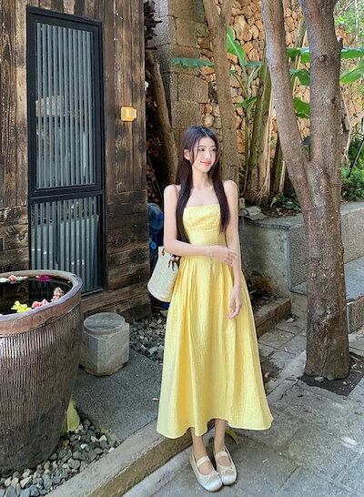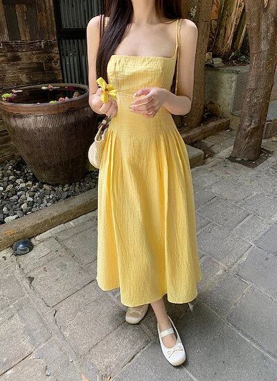 ヘビロテ!キャミワンピース ミモレ丈 キャミソール ノースリーブ Aライン ゆったり 夏 イエロー 黄色 単色 南国 リゾート 韓国ファッション レディース おしゃれ かわいい カジュアル お出かけ | KAGEYAMA-SECOND