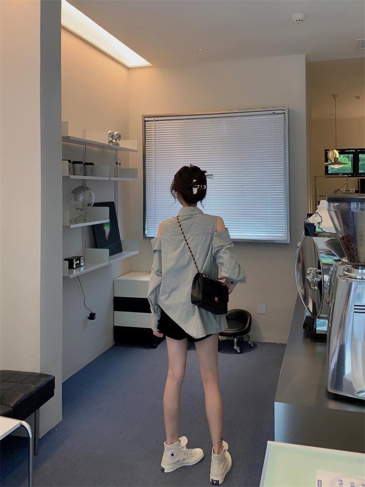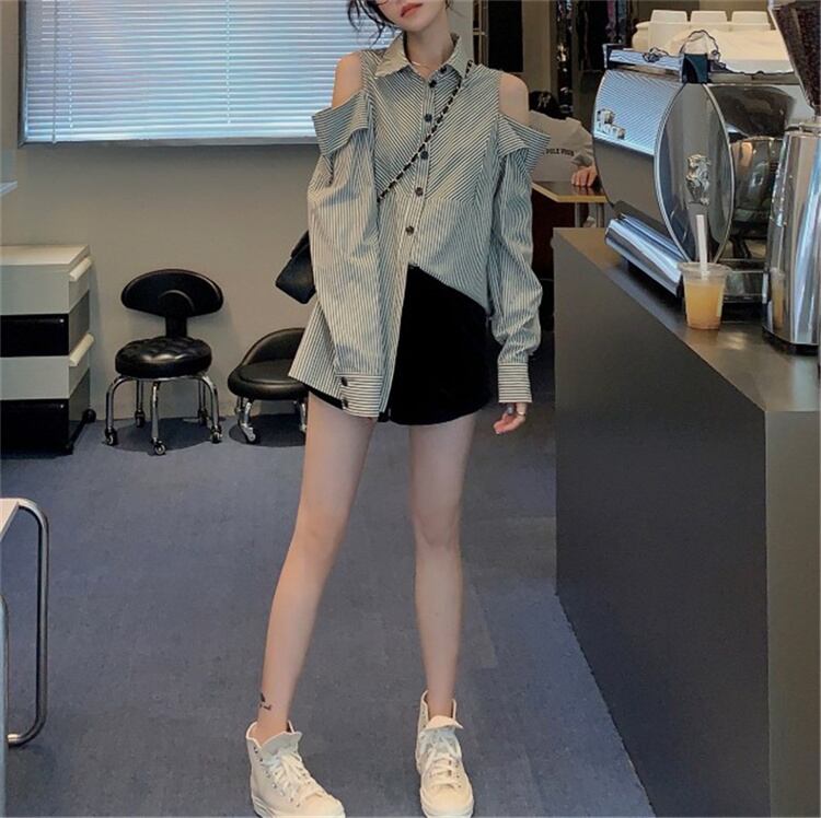 新作限定SALE オフショルダー 長袖 快適である ストライプ シャツ セクシー レトロ ゆったりする