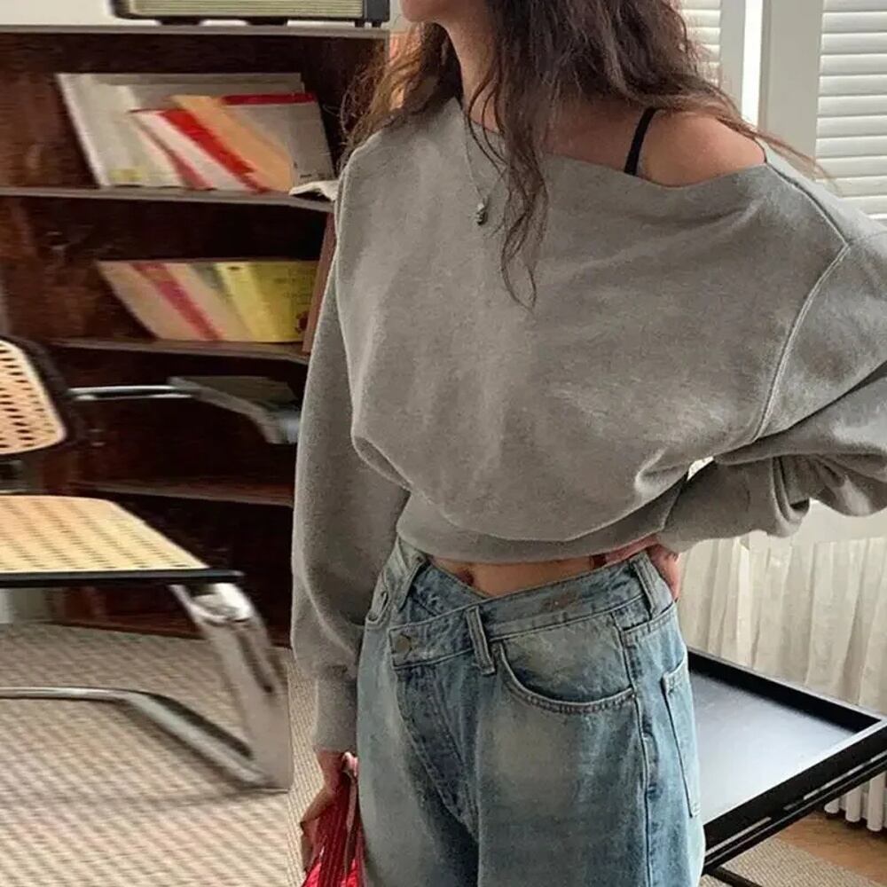 Deeptown-女性のy2kオフショルダースウェットシャツ、韓国のストリートウェア、長袖、ゆったりとした、セクシーな灰色のクロップトップ、秋、2024 パーカー ジャージ y2k T240908165849_01 | KAGEYAMA-SECOND