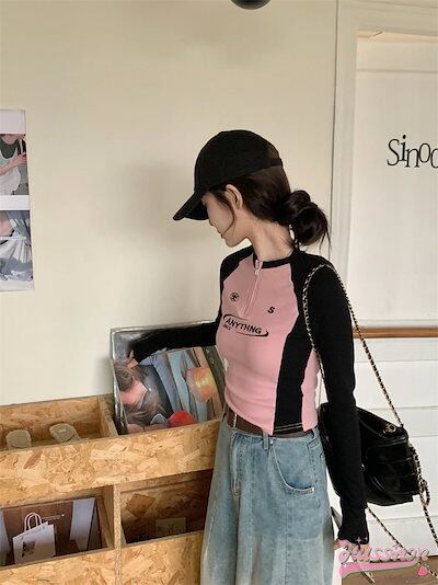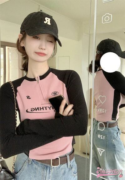 2024秋 長袖 Tシャツ ショート丈 カットソーワッペンK-POPトップスバイカラーカジュアルタンク 韓国系ストリートタイトネックスリーブハーフ T ファッションレディースかわいいサイド衣装風冬 | KAGEYAMA-SECOND