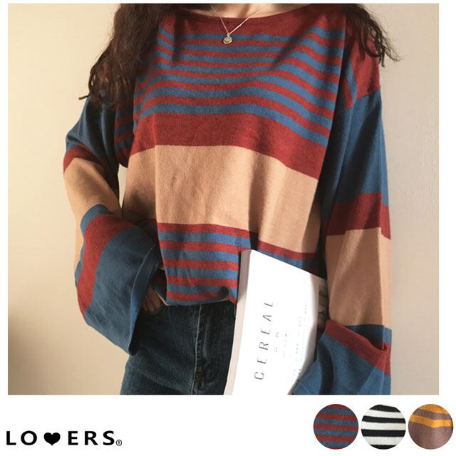 ボーダーニット【即納】トップス ニット オータムカラー 長袖 ワイドスリーブ ゆったり 袖コンシャス
