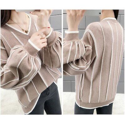 ニットセーター レディース 秋冬40代ス 長袖 アウターvネックパフスリーブ メリヤス ニットソー ニットセーター ロング丈 メリヤス風 通勤 OL 着痩せ