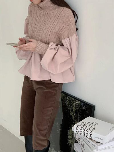 異素材切り替えニットセーター レディース 長袖 秋冬 ハイネック 異素材ドッキング ボリューム袖 ニット トップス ケーブル編み セーター プルオーバー 長袖 体型カバー 着映え トレンド カジュアル | KAGEYAMA-SECOND