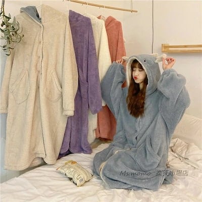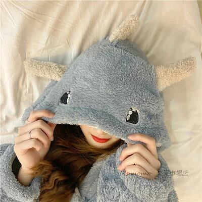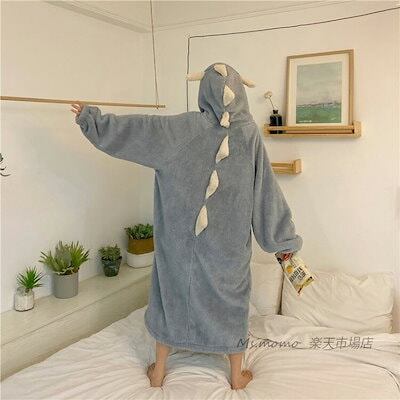 厚手フランネル 恐竜フード連れ 前開き レディース もこもこパジャマ ネグリジェ ナイトロープ ルームウェア ネグリジェ バースロープ オシャレ ロング丈ワンピース 部屋着 秋冬 長袖ナイトガウン 可 | KAGEYAMA-SECOND