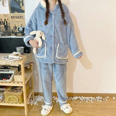 モコモコルームウェア オシャレ フランネルルームウェア 可愛い 冬 ゆったり韓国風 前開き パジャマ 長袖 上下セット 部屋着 パジャマ 暖かい フード連れ 厚手 レディース | KAGEYAMA-SECOND