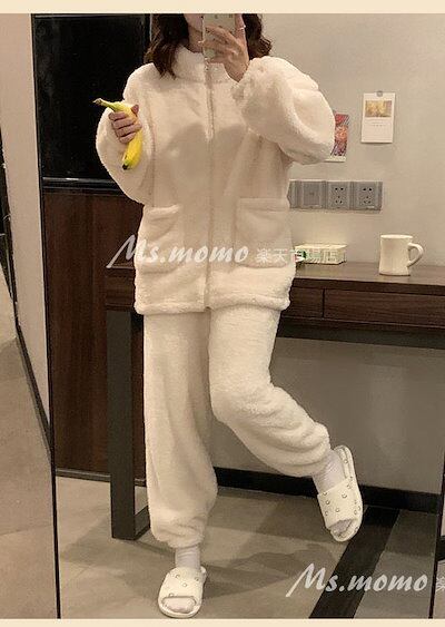 オシャレ 冬 前開き レディース 可愛い無地 モコモコルームウェア フランネルルームウェア 長袖パジャマ 暖かい上下セット 部屋着 パジャマ 厚手 ゆったり韓国風