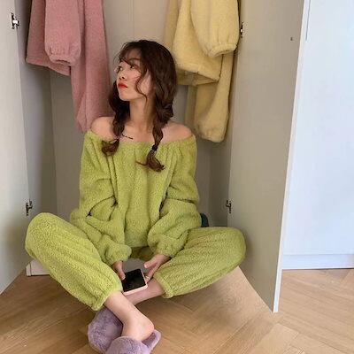 ルームウェア 裏起毛ファッション韓国 二点セット パジャマ フランネル コーラルフリース 保暖 秋冬 セットレディース 部屋着寝間