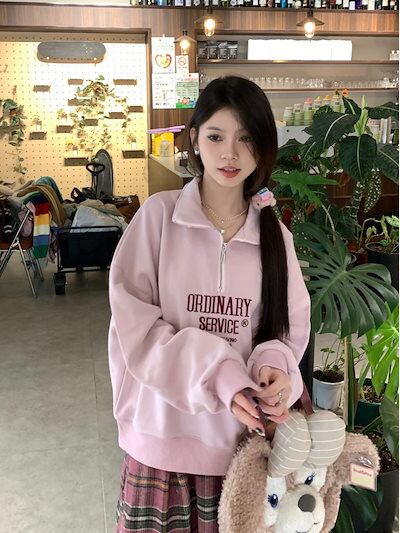 LA PELLE韓国 パーカー ピンク ハーフジップ ラペル スウェット レディース 秋 ルーズ レター トップス