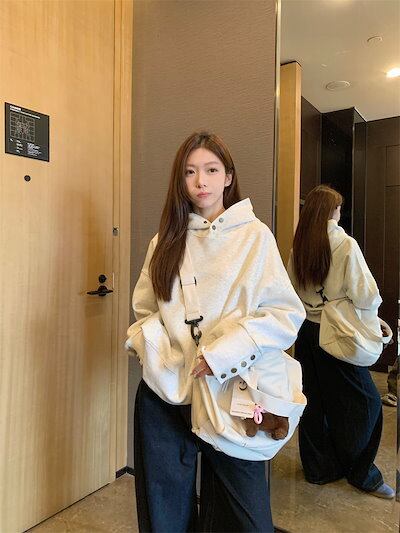 2024秋冬プルオーバー パーカー 首元ボタン 袖ボタン フード付き スウェット トップス ルーズ 長袖 レトロ 韓国ファッション レディース