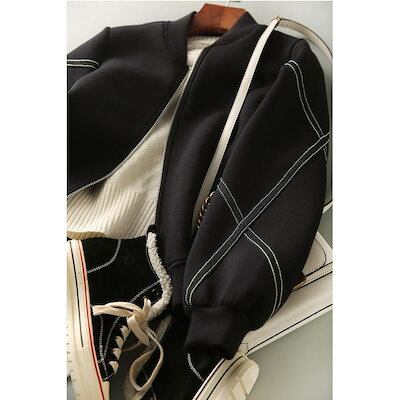 クロスデザイン ノーカラーブルゾン ショート丈 ルーズジャケット ポケット付き 大人カジュアル ミリタリージャケット ブラック レディース