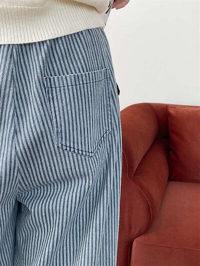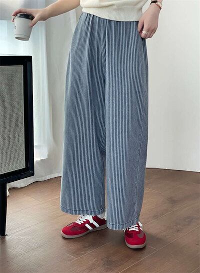ワイドパンツ デニム レディース ワイドパンツ オールシーズン ジーンズ ズボン ボトムス デニムパンツ ストレッチ ゆったり 春 夏 秋 冬 コットン ポケット ウエストゴム 柔らかい ストライプ柄 | KAGEYAMA-SECOND